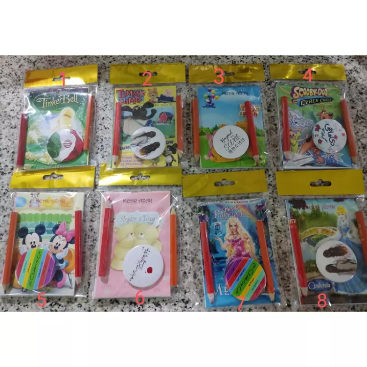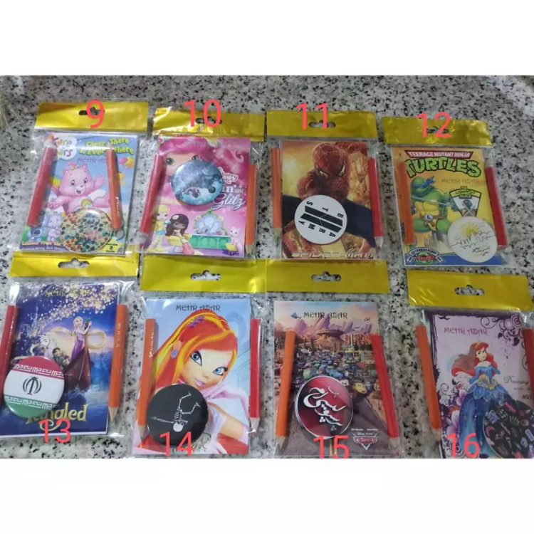 دفترچه یادداشت ابعاد دفترچه ۸×۱۱ دفترچه 20برگ یا 40صفحه مداد سیاه و قرمز کوتاه یک عدد پیکسل یا استیکر به صورت رندم می باشد در یک سلفون آویز دار بسته بندی شده در صورت نیاز به تعداد بالا و خرید کارتنی قیمت پایین تر محاسبه می گردد.