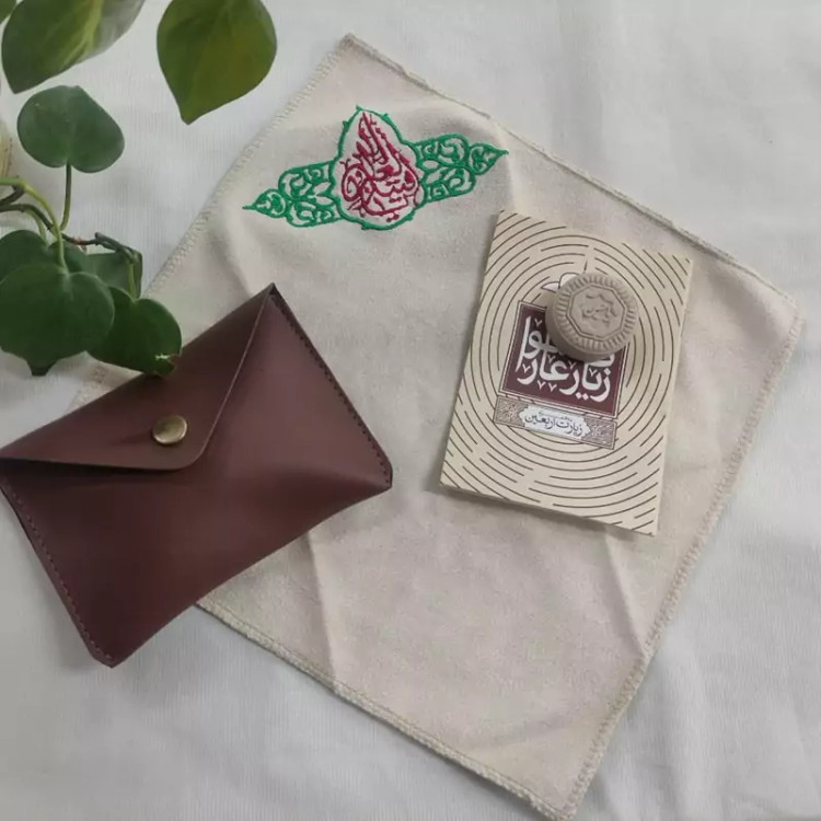 پک اشک تربت نفیس شامل: دستمال اشک(مخمل گلدوزی) کتابچه زیارت عاشورا و اربعین مهر کیف چرم